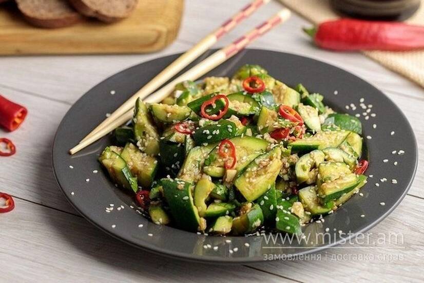 Огірки, перець гострий, кунжутна олія, кунжутні зернята, соєвий соус, яблучний оцет, цукор, сіль, часник.