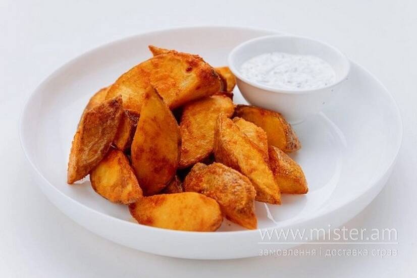 Картопля, спеції, соус: сметана, зелень, часник.