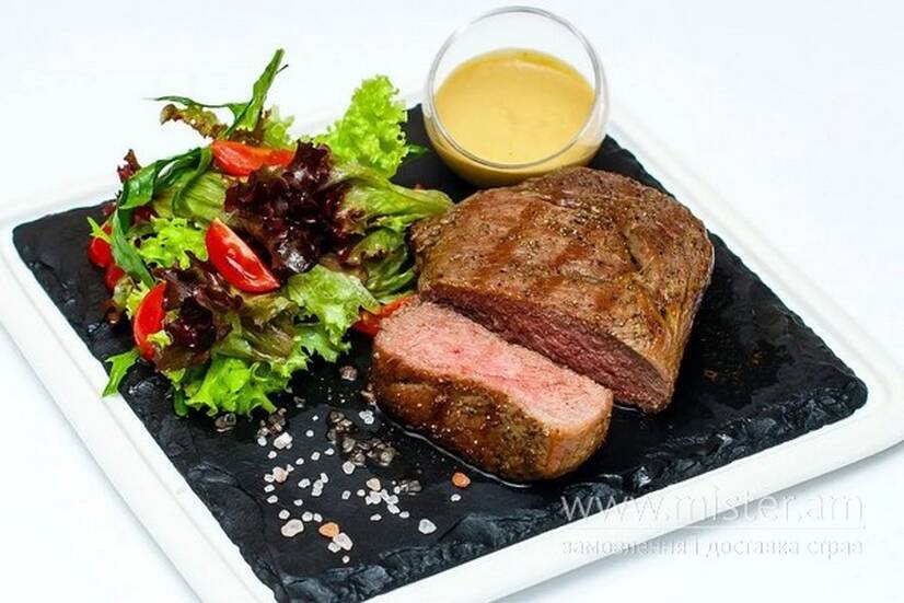 Вагова страва. Вартість вказана за 100 грамм готового продукту. Орієнтовна вага готового стейку 250 грам.