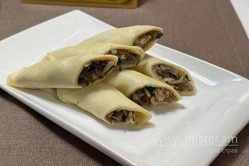 Куряче філе, печериці, цибуля, масло вершкове, млинці.