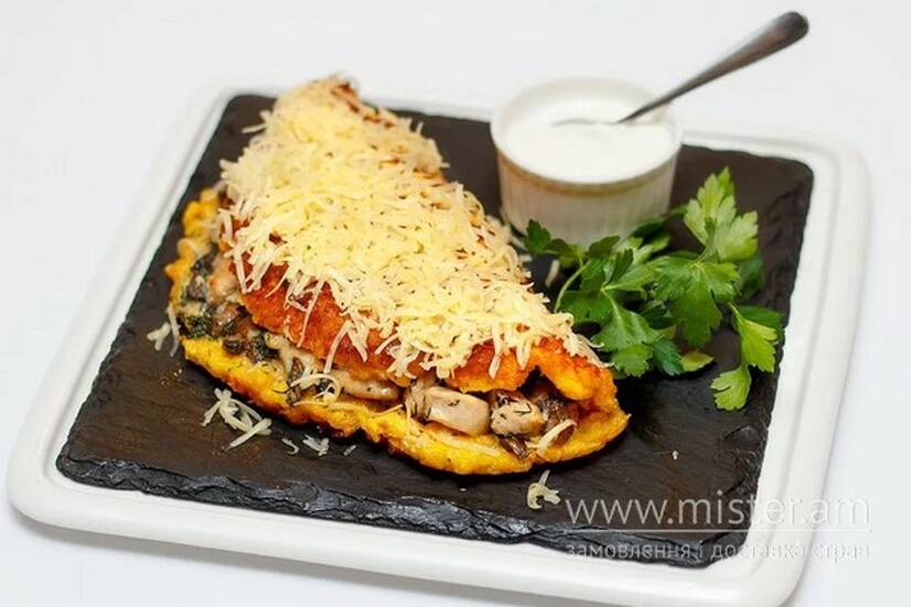 Дерун панський, з начинкою із курки, грибів, та зелені. Подається зі сметаною.