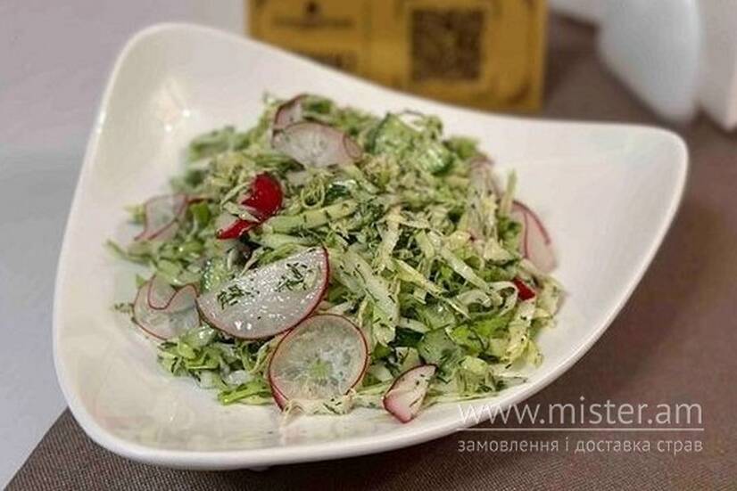 Молода капуста, огірок, редис, оливкова олія, сіль.