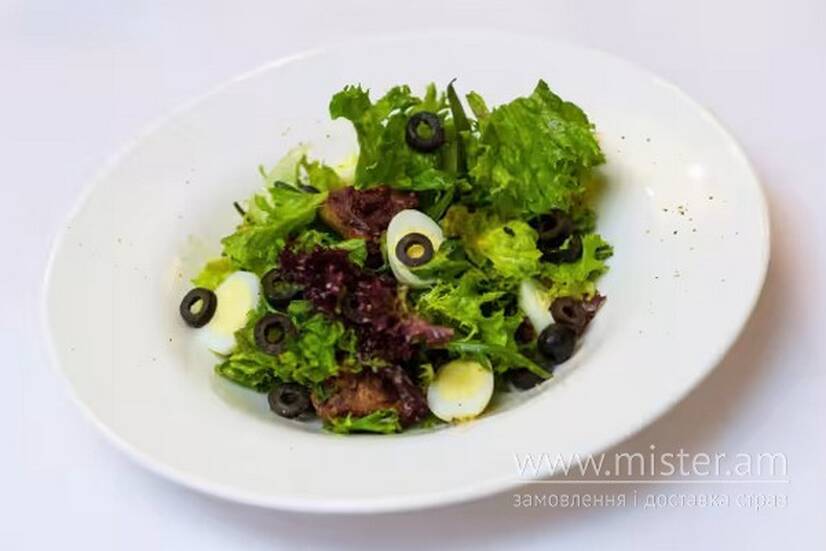 Куряча печінка, печериці, черрі, маслини, мікс салатів, яйце перепелине, медово-гірчична заправка.