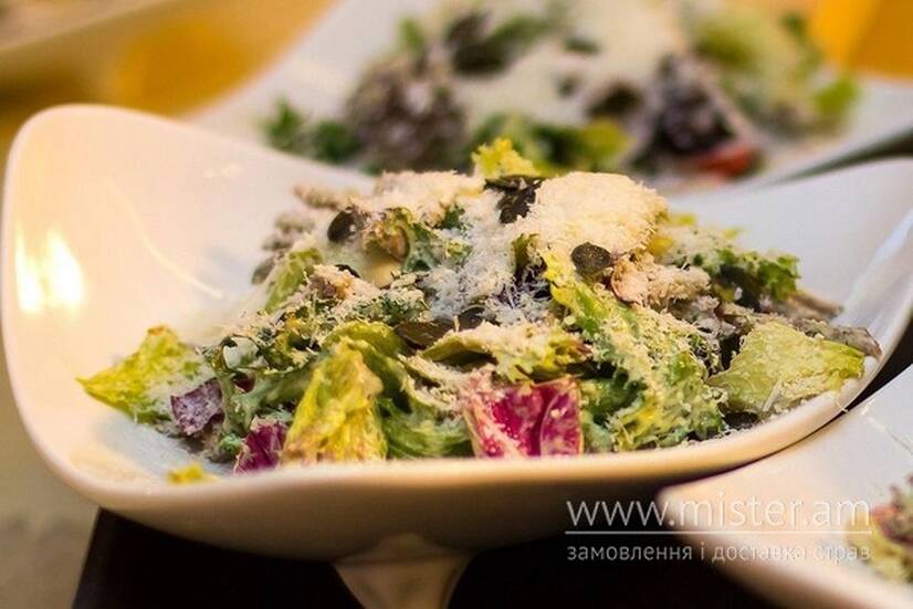 Язик телячий, мікс салату, томати чері, яйця перепелині, кінза, майонез, часник.