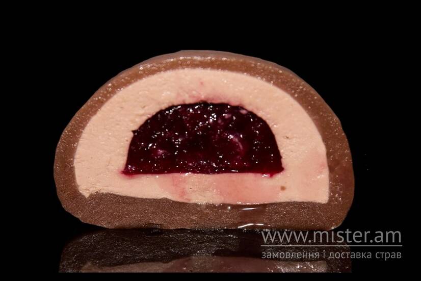 Крем-мус (сир вершковий, вершки, молочний шоколад, чорний шоколад), пюре вишні, рисове тісто.