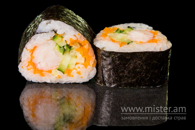 Креветка, огірок, ікра "Масаго", соус "Спайсі", рис, норі.