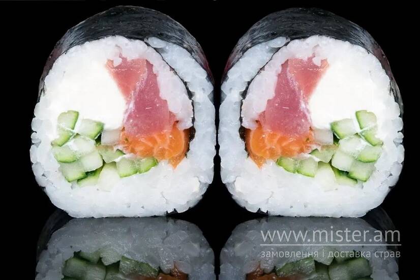 Лосось, тунець, сир вершковий, огірок, соус спайс.