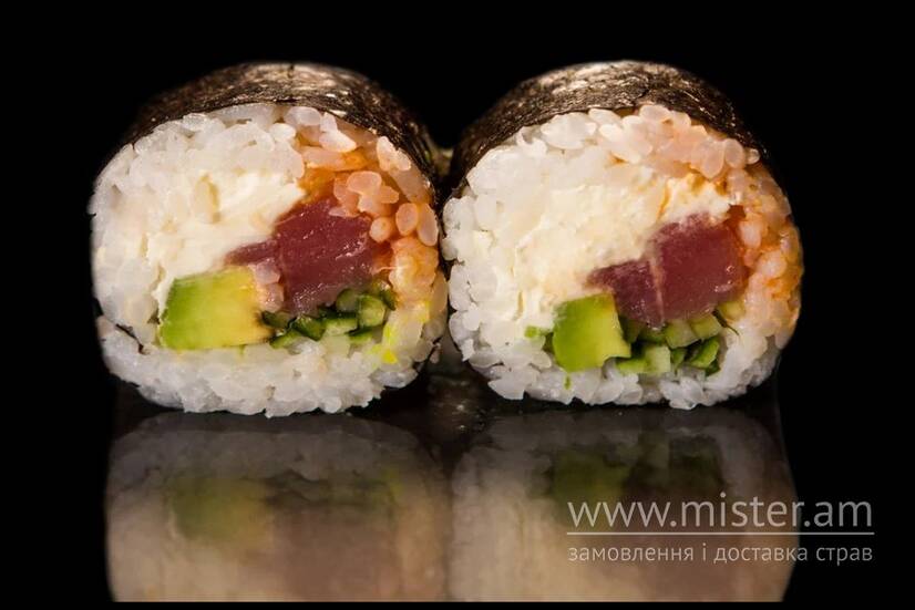 Рис, норі, тунець, соус ширача (гострий), сир вершковий, огірок, авокадо.