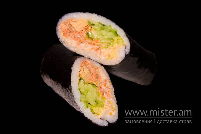 Краб мікс (сніжний краб, майонез, ікра масаго), лосось в соусі теріякі, салат айсберг, огірок, соус спайсі, соус горіховий, тамаго рис, норі.