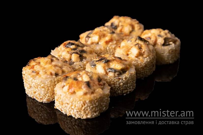 Вугор, соус спайсі (гострий), авокадо, сир вершковий, кунжут, рис, норі.