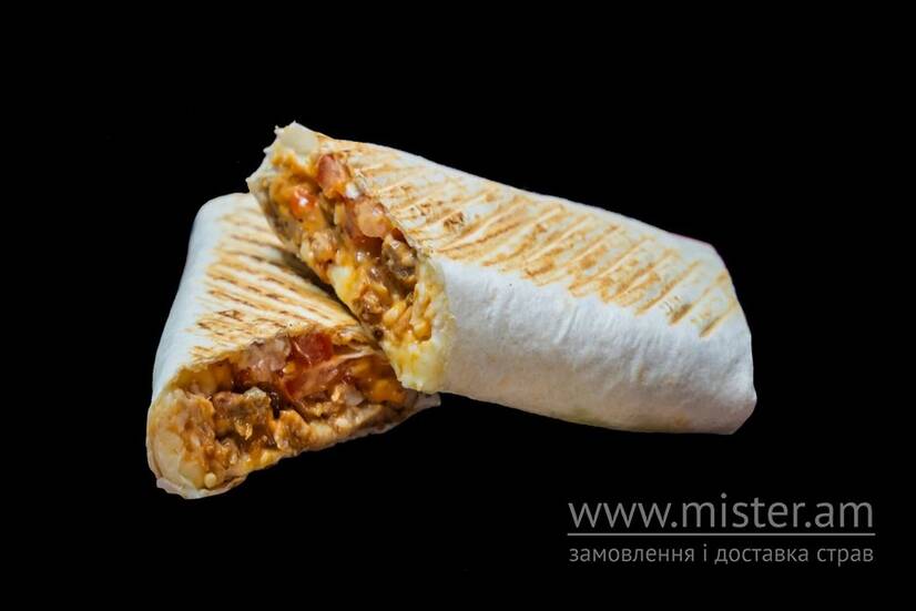 Кебаб на вибір (курячий, телятина), помідор, сир моцарела, сир чедер, салат айсберг, соус часниковий, соус сирний.