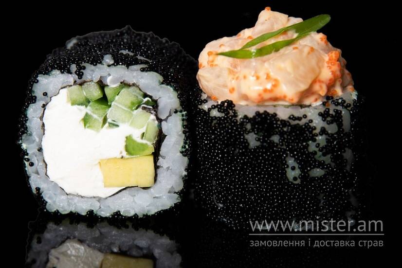 Гребінець, ікра масаго, сир вершковий, ікра масаго (чорна) ,соус спайсі, огірок, авокадо, цибуля зелена.