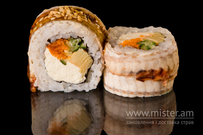 Вугор, тамаго, вершковий сир, огірок, ікра "Масаго", соус "Унагі".