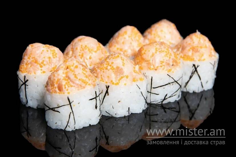Лосось, соус спайс, ікра тобіко, рис, норі, тамаго, сир вершковий.