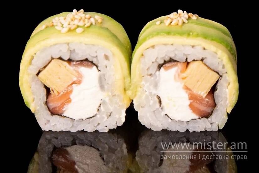 Лосось, авокадо, тамаго, сир вершковий, рис, норі, соус унагі, кунжут.
