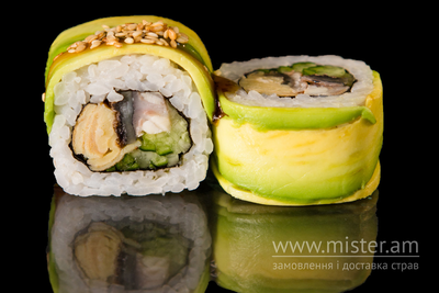Рис, норі, вугор, омлет "Тамаго", огірок, авокадо, соус "Унагі", кунжут.