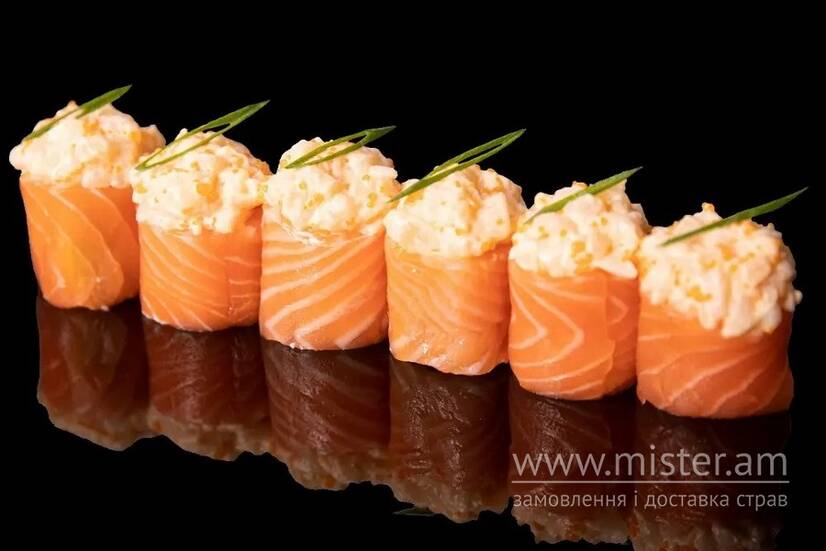 Лосось, сир вершковий, авокадо, гребінець, соус спайсі, ікра тобіко, цибуля зелена, соус горіховий.