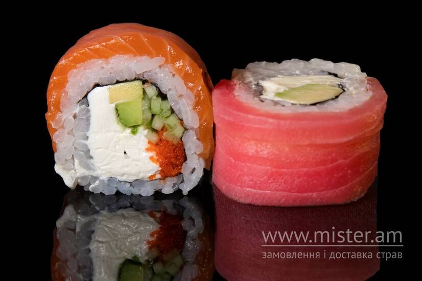 Лосось, тунець, сир вершковий, ікра тобіко, огірок, авокадо, рис, норі.