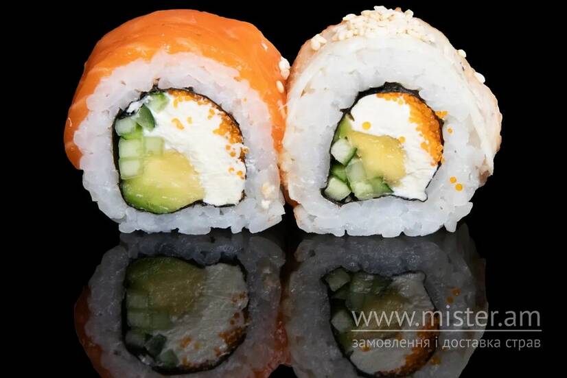 Лосось, вугор, сир вершковий, ікра тобіко, огірок, авокадо, рис, норі.