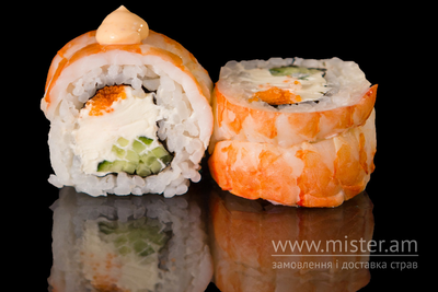 Креветка, сир вершковий, ікра "Масаго",огірок, соус "Спайсі", рис, норі.