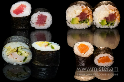 Макі з тунцем, макі з лососем, футомакі з тунцем, Торі рол.