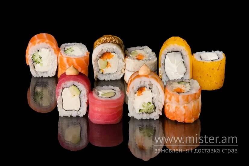 Філадельфія зі свіжим лососем, Філадельфія з вугрем, сирний з грушею, Філадельфія з тунцем, Філадельфія з креветкою.