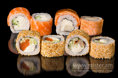 Філадельфія LUX з свіжим лососем, Філа унагі, Філадельфія в кунжуті з копченим лососем, Філадельфія з грушею.
