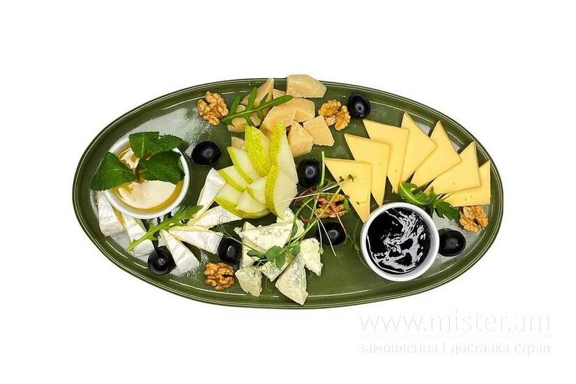 Сир камамбер, пармезан, чедр, дор-блю, грецький горіх, мед, соус ягідний, виноград, груша.