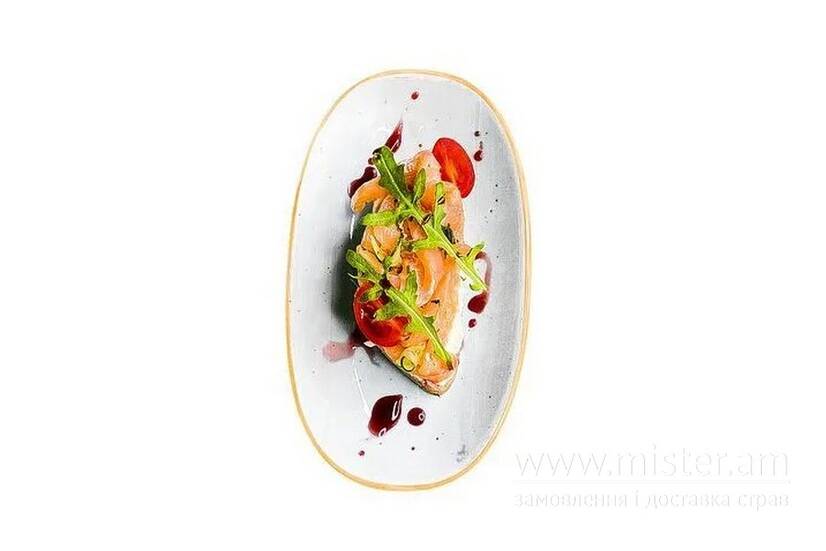 Хрустка чіабатта, крем-сир, форель гравлакс, чері, огірок та руккола.
