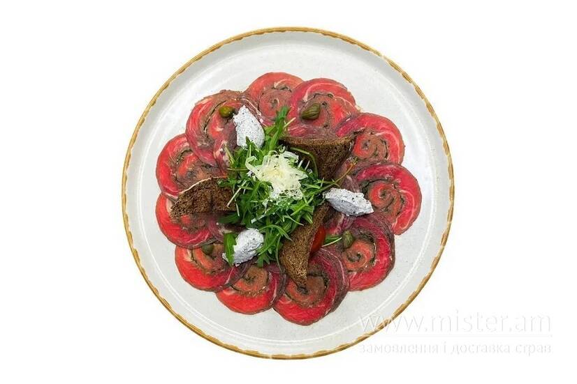 Маринована телятина, руккола, трюфельний крем-сир, чері, каперси, тости, пармезан.