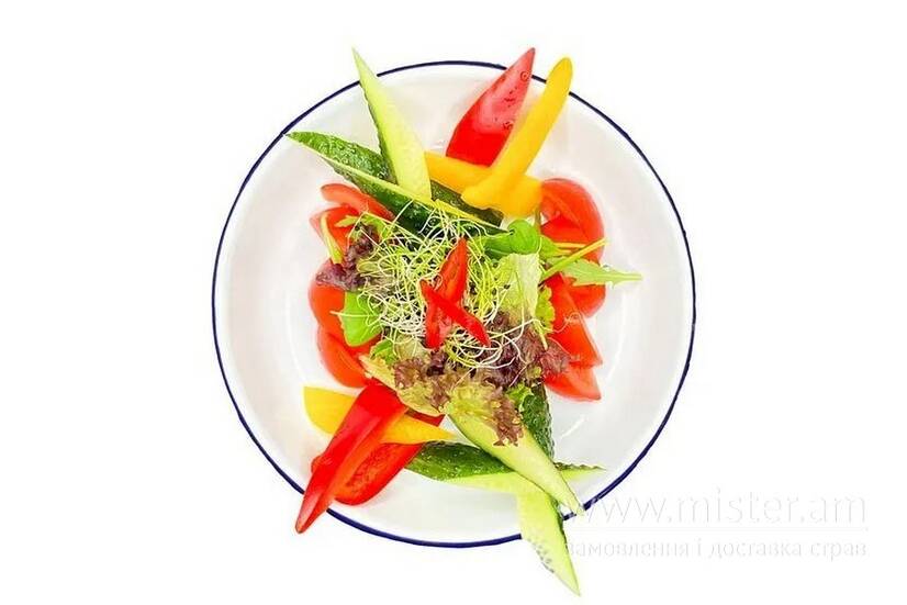 Свіжі огірки, томати, болгарський перець та багато зелені.