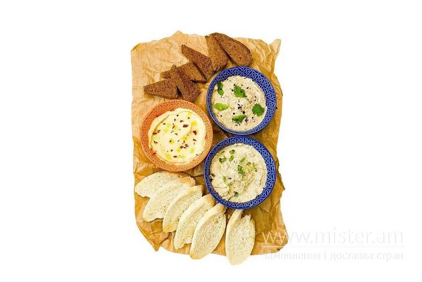 Сет складається з намазанок Бабагануша, Форшмака та Хумуса. Бабагануш - намазка на основі баклажану. Хумус - намазка на основі бобів. Форшмак - намазка на основі оселедцю.