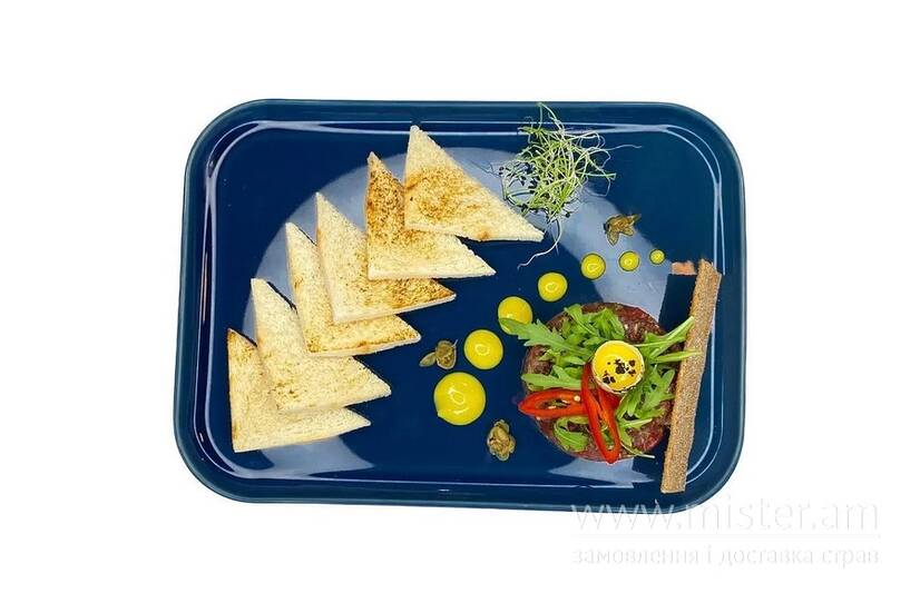 Тар-тар з телятини, перепелиним яйцем та хрусткими грінками
