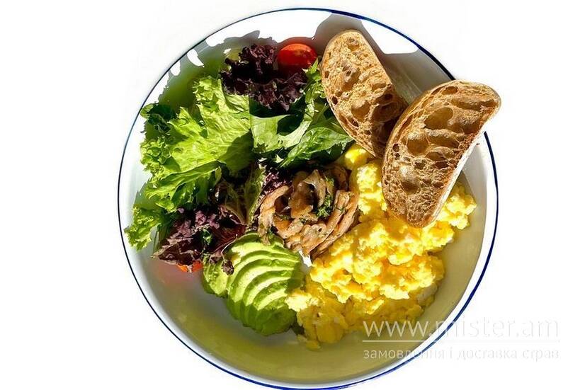 Ніжний скрембл (взбиті яйця з молоком), авокадо, форель гравлакс, мікс салату, чері, чіабата.