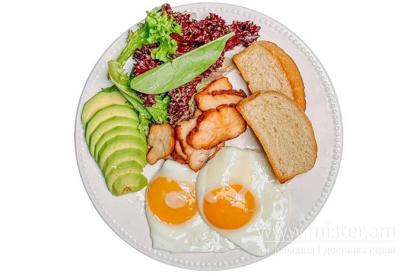 Два яйця, мікс салату, філе куряче су-від, авокадо, чері, чіабата.