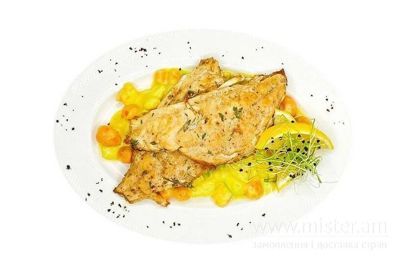 Філе дорадо, овочеве соте (морква-бейбі, цукіні, картопля) у вершковому соусі з креветками та м'ятою.