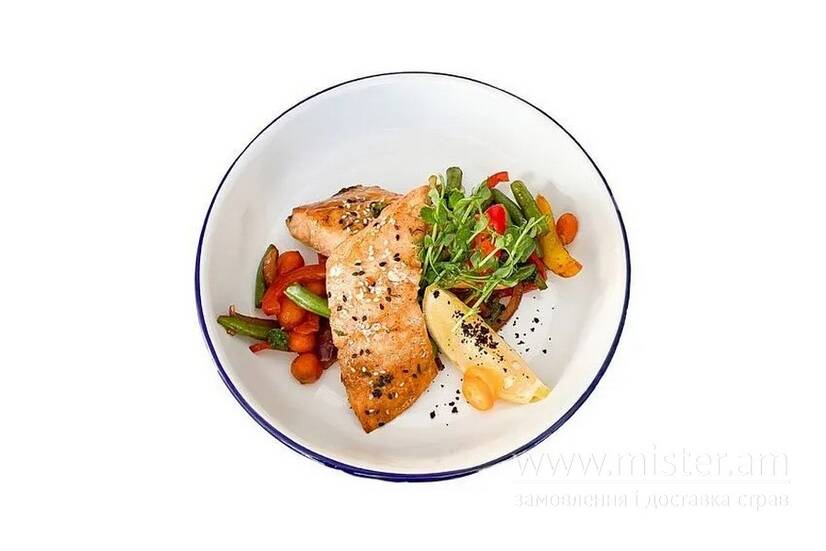 Філе форелі, морква, цибуля, печериці, перець болгарський, соус теріякі, кокосові вершки, часниковий соус.
