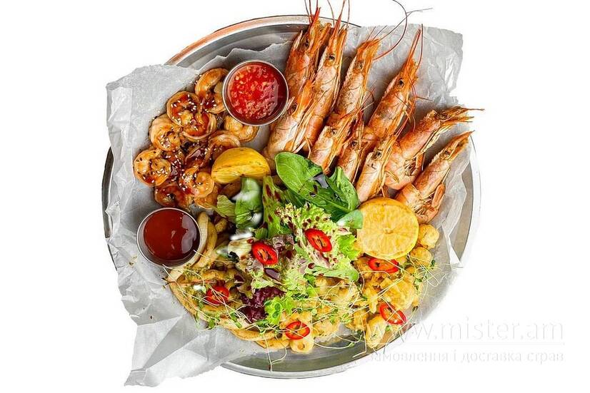 Лангусти ни 350 г, кальмар гриль 200 г, м'ясо мідій 100 г, тигрова креветка 100 г, овочі на мангалі 200 г та в доповнення мікс салату та соуси кисло-солодкий та світ-чілі.