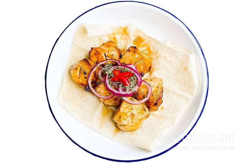 Підготовлене м`ясо курки, подається на тонкому лаваші.
