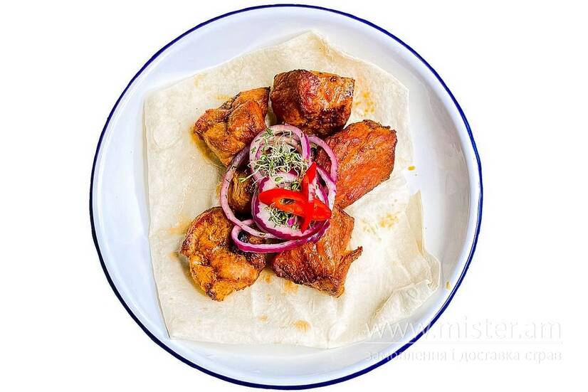 Підготовлене м`ясо свинного ошийка, мариноване у спеціях, подається на тонкому лаваші.