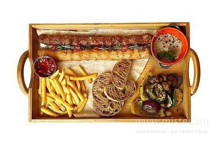 Люля-кебаб з курочки 150 г, люля-кебаб з телятини 150 г, овочі на мангалі 100 г, бабагануш 50 г, картопля фрі 100 г, чіабата, соус томатіно.