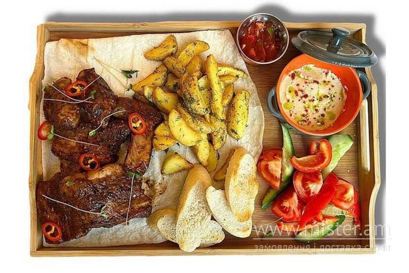 Ребра тонкі 400г, овочева нарізка 150 г, картопля по-уланівські 100 г, хумус 50 г, багет, соус томатіно.
