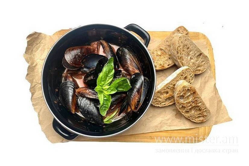 Чилійські мідії тушкуються у соусі з білого вина, часнику з додаваням соусу з томатів "Пелаті". Подаються з зеленню, лимоном та грінками.
