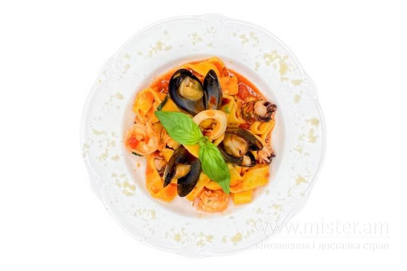 Паста (власного виробництва), мікс морепродуктів (м`ясо мідії та мідії в мушлях, кальмар, креветка, бейбі восьминіг), біле вино, вершкове масло, томати пелаті, часник, базилік.