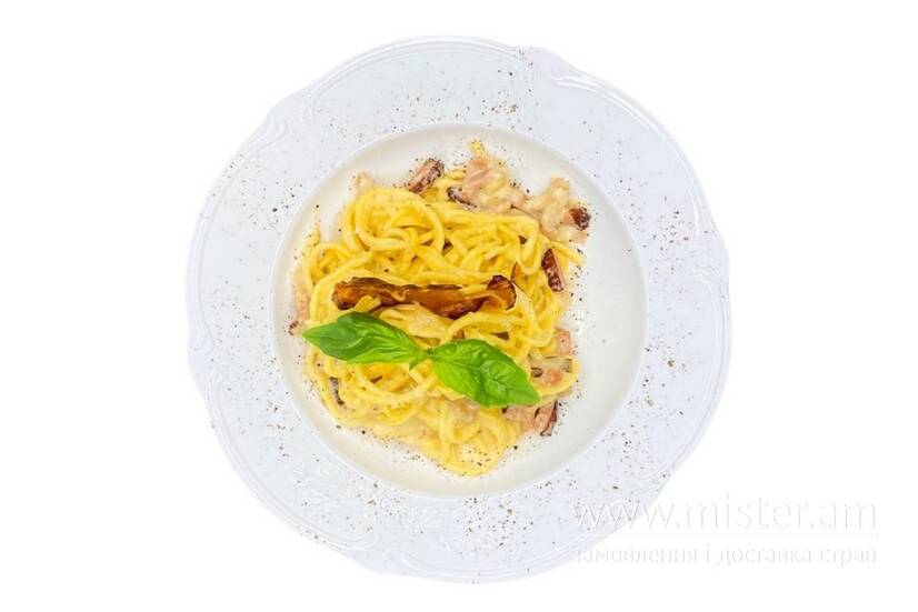 Паста (власного виробництва), бекон, вершки, пармезан, яєчний жовток, базилік.