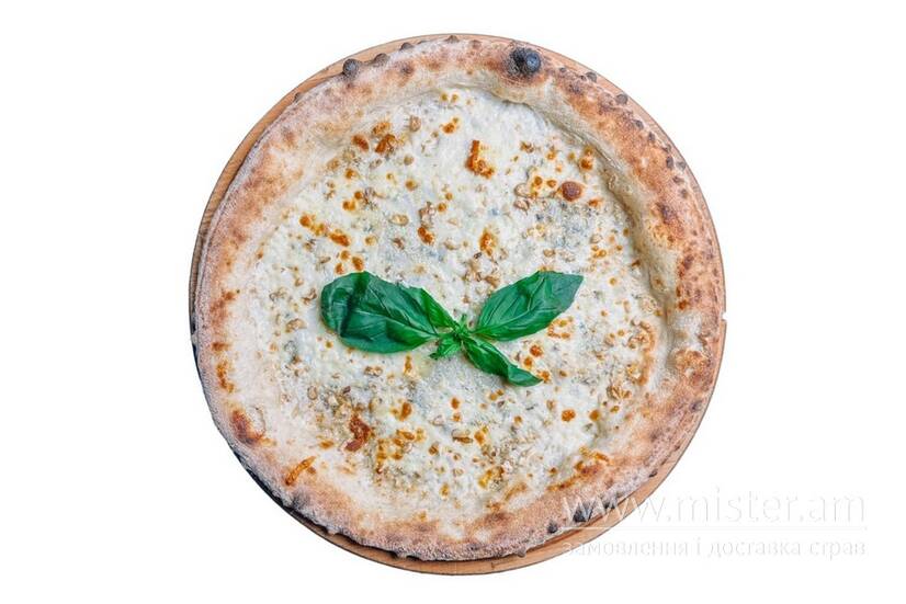 Вершковий соус, моцарела копчена, моцарела, дор-блю, пармезан, грецький горіх, базилік.