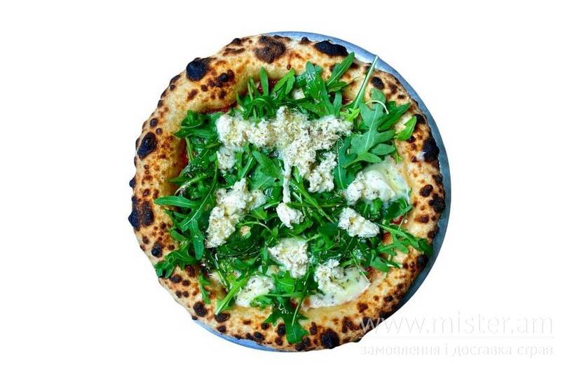 Томатний соус в поєднанні з моцарелою, страчателою та руколою з додаванням оливкової олії та італійських спецій.