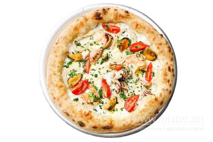 Вершковий соус, мікс морепродуктів ( мясо мідії, кревета, бейбі восьминіг, кальма), цедра лайму, чері, моцарелла, петрушка.