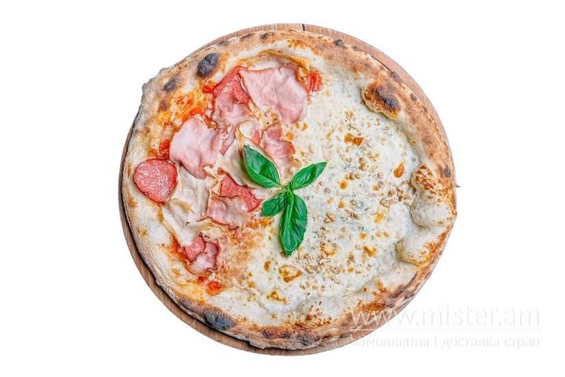 Шинка копчена, бекон копчений, салямі, курка копчена, соус томатний, моцарела, помідор, дорблю, моцарела, соус вершковий, пармезан, грецький горіх.