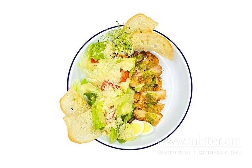 Куряче стегно, салат ромен та айсберг, перепелине яйце, томати чері, хрусткі грінки, сир пармезан, заправляємо соусом "Цезар".